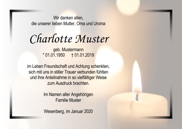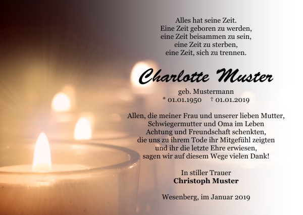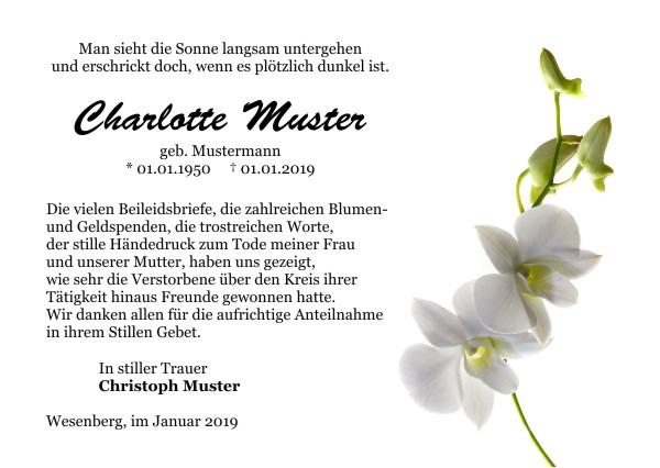 Bei einem Trauerfall und Beerdigung bedarf es nicht unbedingt vieler gesprochener Worte. Drücken Sie mit unseren Trauerdanksagungen Ihr Mitgefühl aus. Ihre Mitmenschen werden es Ihnen danken. Nehmen Sie sich die Zeit, die Sie brauchen, um in ihrem Trauertext die richtigen Worte zu finden. Unsere schlichten Trauerfall Dankeskarten können Sie individuell gestalten. Wir bieten Motive mit Blumen, Rosen, Lilien, Calla, Orchideen. Hintergründe mit Sonnenuntergängen, Landschaften, Bergen und den Alpen, aber auch Hintergründe mit religiösen Motiven, Kreuzen, Engeln und Lichtern. Sehr beliebt sind unsere persönlichen Trauerkarten mit Foto oder Kerzen.