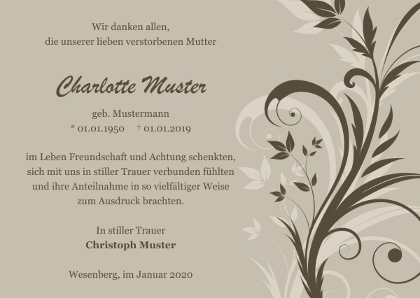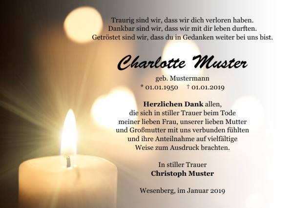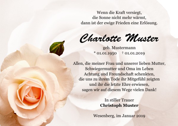 Bei einem Trauerfall und Beerdigung bedarf es nicht unbedingt vieler gesprochener Worte. Drücken Sie mit unseren Trauerdanksagungen Ihr Mitgefühl aus. Ihre Mitmenschen werden es Ihnen danken. Nehmen Sie sich die Zeit, die Sie brauchen, um in ihrem Trauertext die richtigen Worte zu finden. Unsere schlichten Trauerfall Dankeskarten können Sie individuell gestalten. Wir bieten Motive mit Blumen, Rosen, Lilien, Calla, Orchideen. Hintergründe mit Sonnenuntergängen, Landschaften, Bergen und den Alpen, aber auch Hintergründe mit religiösen Motiven, Kreuzen, Engeln und Lichtern. Sehr beliebt sind unsere persönlichen Trauerkarten mit Foto oder Kerzen.